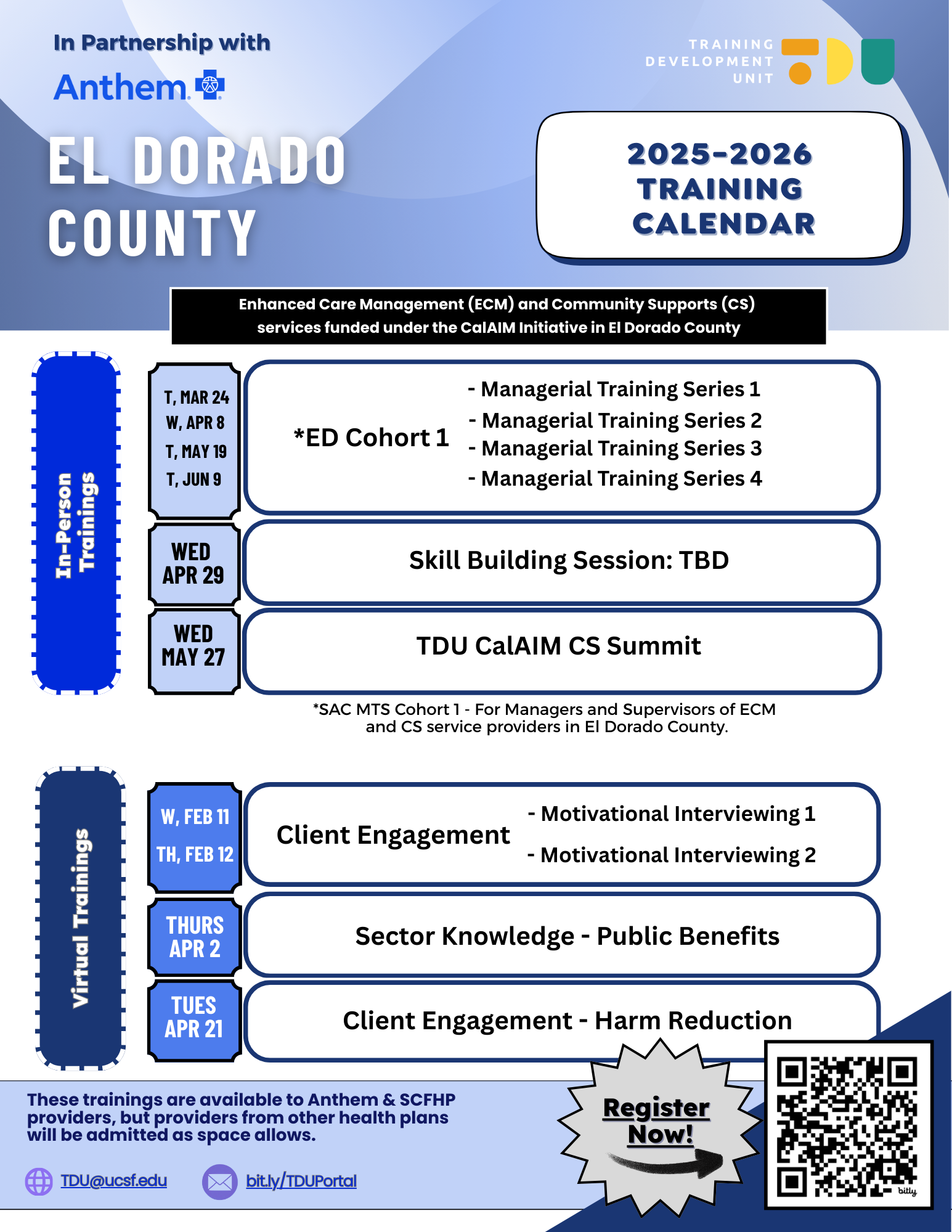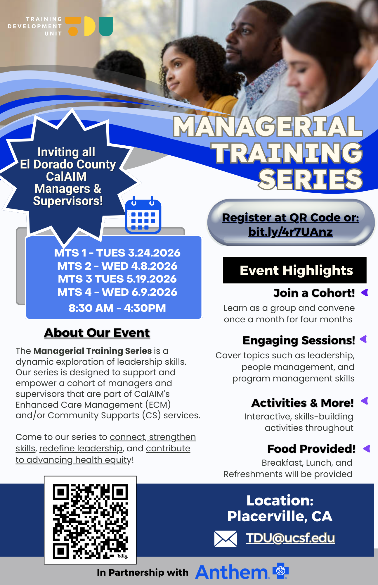 The Training Development Unit (TDU), a project of the Training & Health Equity Collaborative, is funded through Anthem Blue Cross and Alameda Alliance for Health. The TDU provides training and technical assistance to Enhanced Care Management and Community Supports within Alameda County, Los Angeles County, and the Central Valley to increase their knowledge of CalAIM, services for eligible clients, hone consumer engagement skills, support professional development for team members, and strengthen workforce retention. In addition, the TDU provides marketing, registration, virtual session support, materials development, and evaluation for all training offerings.